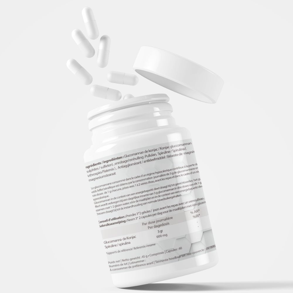 Complément alimentaire naturel, certifié végan, associe deux actifs efficaces – le glucomannane de konjac et la spiruline – pour une solution saine et performante, agissant comme un modérateur d'appétit naturel.