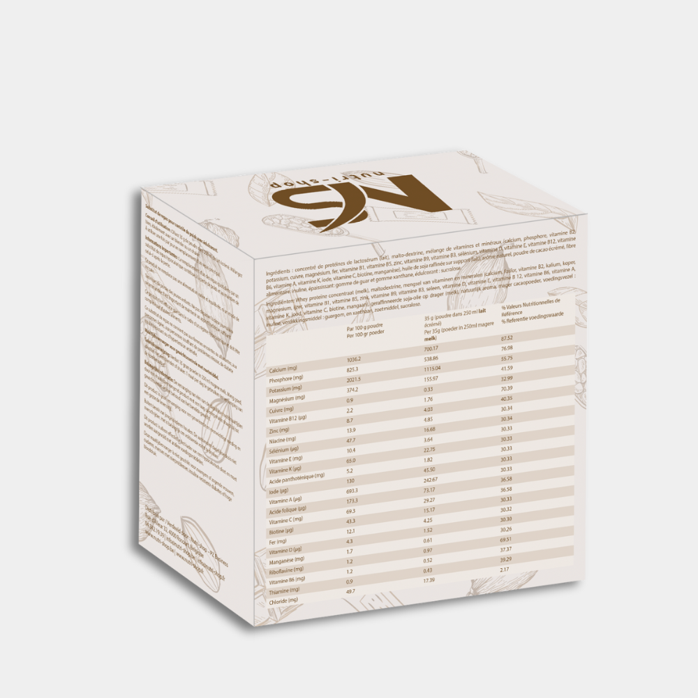 Ingrédients : concentré de protéines de lactosérum (lait), malto-dextrine, mélange de vitamines et minéraux (calcium, phosphore, vitamine B2, potassium, cuivre, magnésium, fer, vitamine B1, vitamine B5, zinc, vitamine B9, vitamine B3, sélénium, vitamine D, vitamine E, vitamine B12, vitamine B6, vitamine A, vitamine K, iode, vitamine C, biotine, manganèse), huile de soja raffinée sur support (lait), arôme naturel, poudre de cacao écrémé, fibre alimentaire: inuline, épaississant: gomme de guar et gomme xanthane, édulcorant : sucralose.
