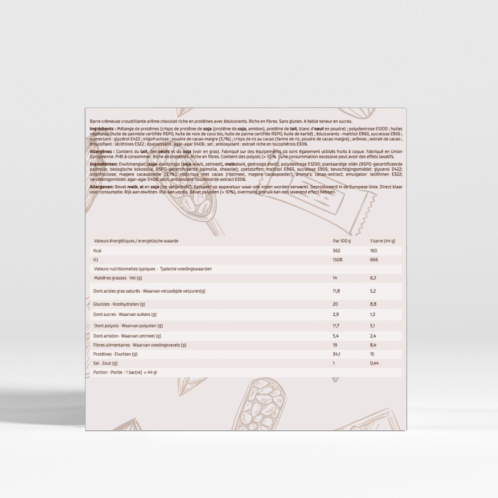 Ingrédients : Mélange de protéines (crisps de protéine de soja (protéine de soja, amidon), protéine de lait, blanc d’oeuf en poudre) ; polydextrose E1200 ; huiles végétales (huile de palmiste certifiée RSPO, huile de noix de coco bio, huile de palme certifiée RSPO, huile de karité) ; édulcorants : maltitol E965, sucralose E955 ; humectant : glycérol E422 ; oligofructose ; crisps de riz bio ; poudre de yaourt (lait) ; lait écrémé en poudre ; arômes ; émulsifiant : lécithines E322 ; épaississant : agar-agar E406 ; sel ; antioxydant : extrait riche en tocophérols E306.