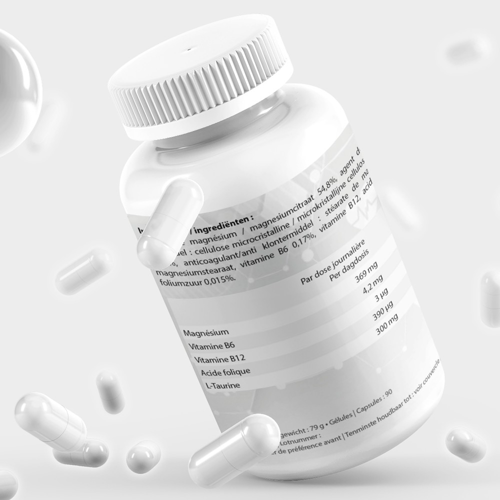 Notre Complexe de Magnésium enrichi en Vitamine B6, B12 et L-Taurine aide à réduire la fatigue, soutient la fonction musculaire normale et contribue à combler les carences en magnésium.