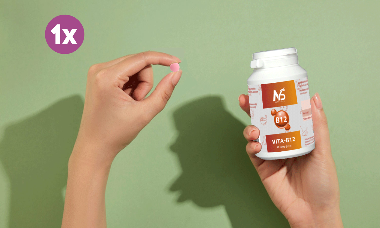 Vitamine B12 saveur menthe – à laisser fondre sous la langue, idéale en cas de déficit en vitamine B. Elle contribue au métabolisme énergétique normal.